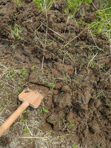 話は戻りますが、復原した木製の鍬でも試してみました。木製の鍬は鋤に比べて掘り下げる深さは浅く、5cm程度でした。1辺ほど掘ってみたところ、作業時間は鋤とそれほど変わりありませんでした。ただ個人的には、重量があるため鋤に比べて大変でした。残りについては、剣先スコップを使って掘ってみたところ、30分ほど(およそ3分の1の時間)で終わってしまいました。鉄の力って偉大だなぁ…、と改めて鉄のすごさを感じました。